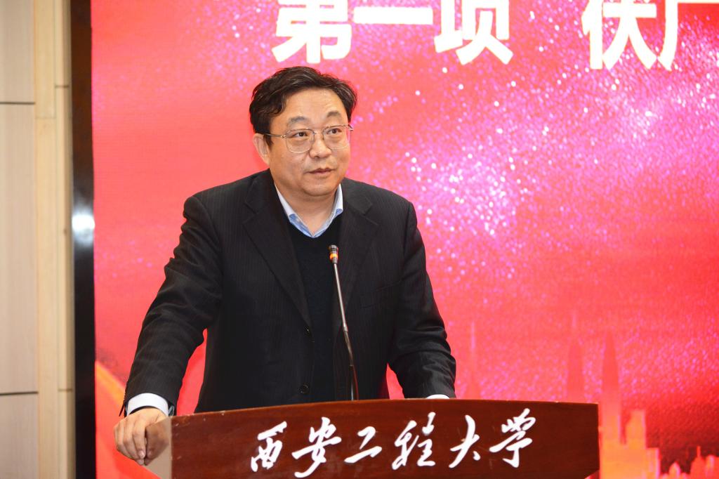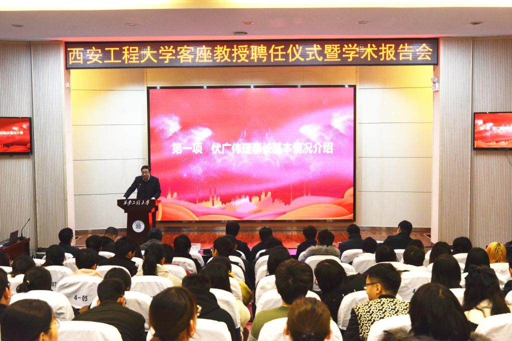在客座教授聘任仪式上。首先,李鹏飞代表学校对出席本次会议的中国纺织工程学会的各位专家领导表示热烈欢迎和衷心感谢。对本次受聘我校客座教授伏广伟的基本情况进行了介绍。