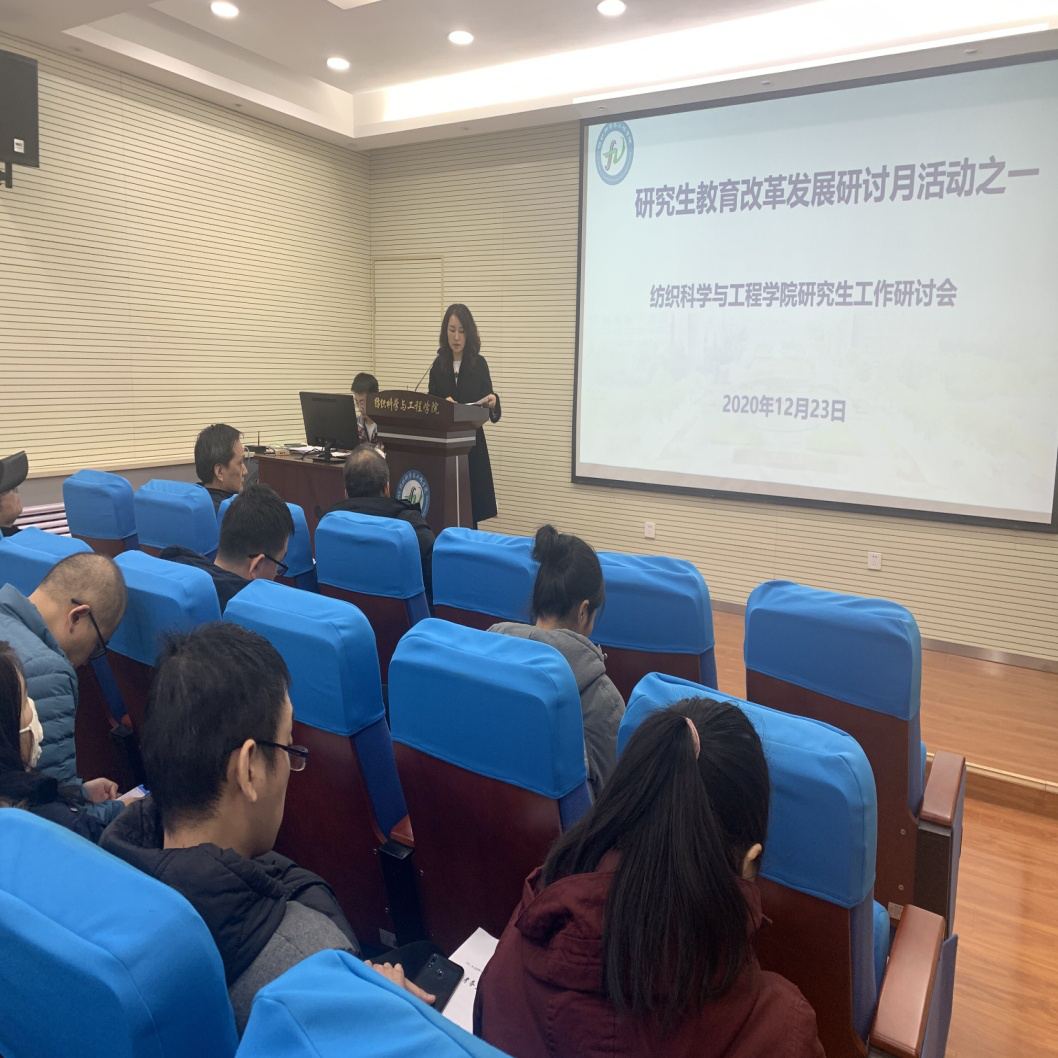 随后,学院党委副书记郭西平解读了学校研究生管理相关制度建设,就研究生管理体制变化作了重点说明,学院应以学校研究生管理相关制度建设文件,结合学院自身情况对其优化、细化,促进学院的研究生教育改革与发展培养。王进美对学院研究生培养体系建设进行汇报,提出学院应以建立围绕纺织产业链设置的前沿纺织技术课程体系,通过选课制,可以按照研究生的个人兴趣,与导师设定的培养目标结合,实现有针对性的培养研究生实践与创新能力;通过建设校企联合研究生实践教育培养基地和制订校企合作框架下的校企双导师研究生联合培养机制,开拓以校企联合研究院为核心开展研究生工程实践与科研训练的培养方式;以纺织前沿技术科研项目为驱动,推行“四阶段培养”模式。