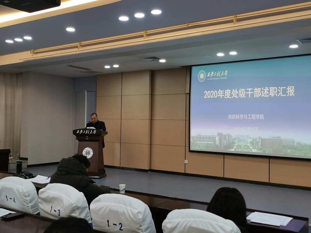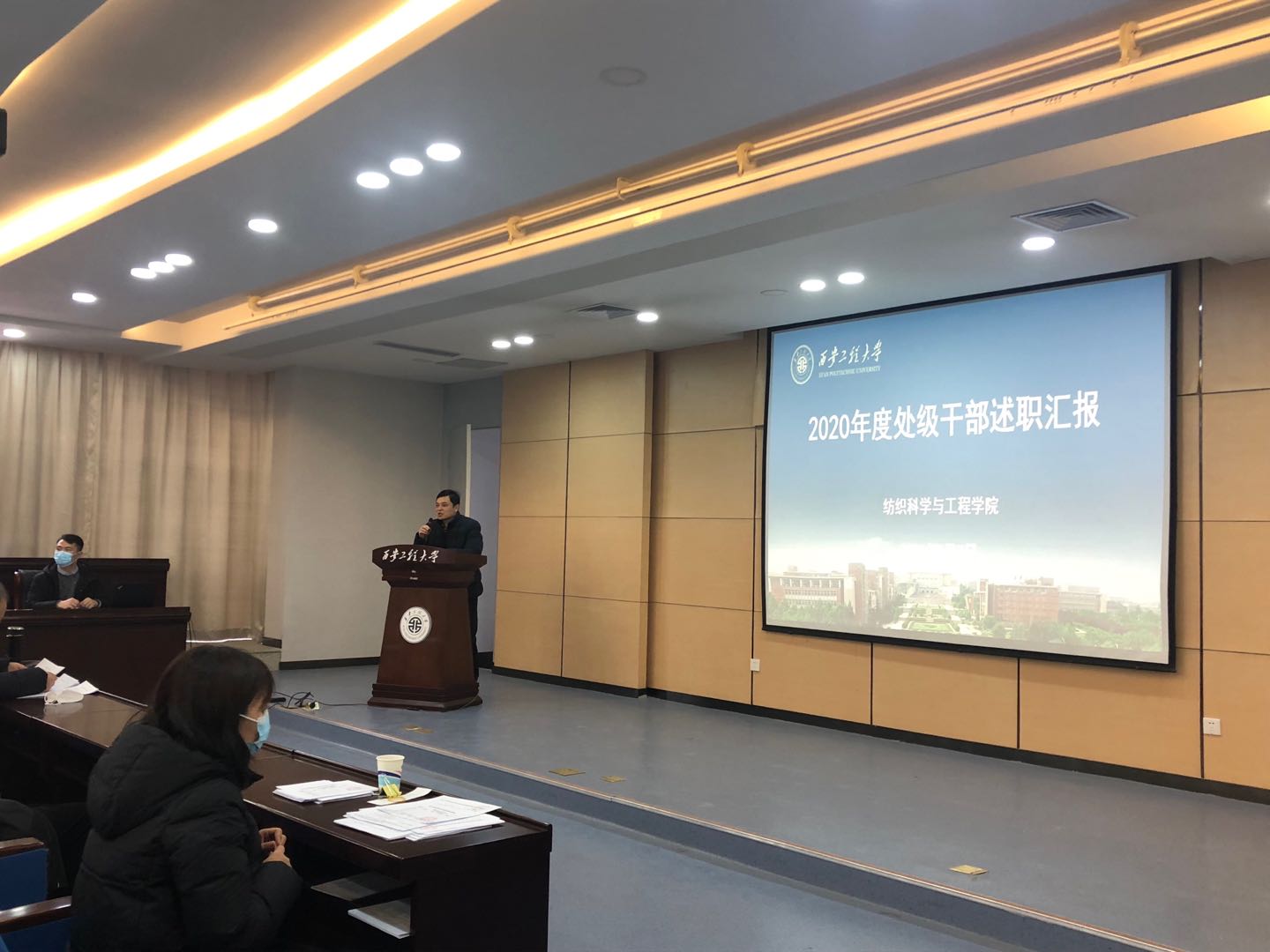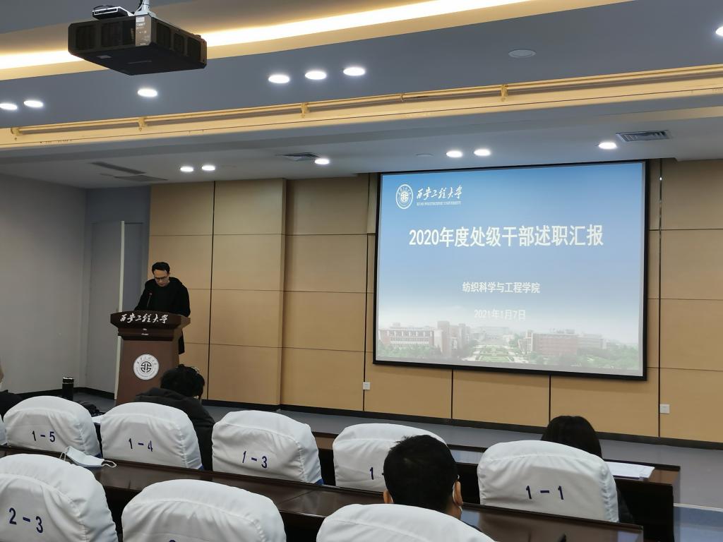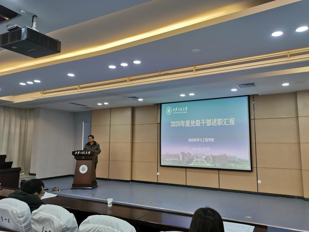 会上,学院执行院长孙润军代表学院领导班子成员从学院年度绩效考核目标任务及完成情况、年度亮点工作、工作开展中存在的问题及原因分析、综合治理及安全稳定等四个方面进行了汇报。接着,他重点介绍了学院2020年亮点工作,主要概括为“1321”,即1个核心有进展—博士点申报,3个成果有突破—首获我校第一完成单位中纺联科技进步一等奖、首获我校唯一一门国家级一流本科课程、首获我校唯一一门国际在线英文课程,2个显著增长—科研到款显著增长和研究生招生数量突破百人,1个坚持—坚持疫情防控不放松。最后他就个人全年在思想政治理论学习、教学成果、科研业绩、廉政方面进行了总结汇报。