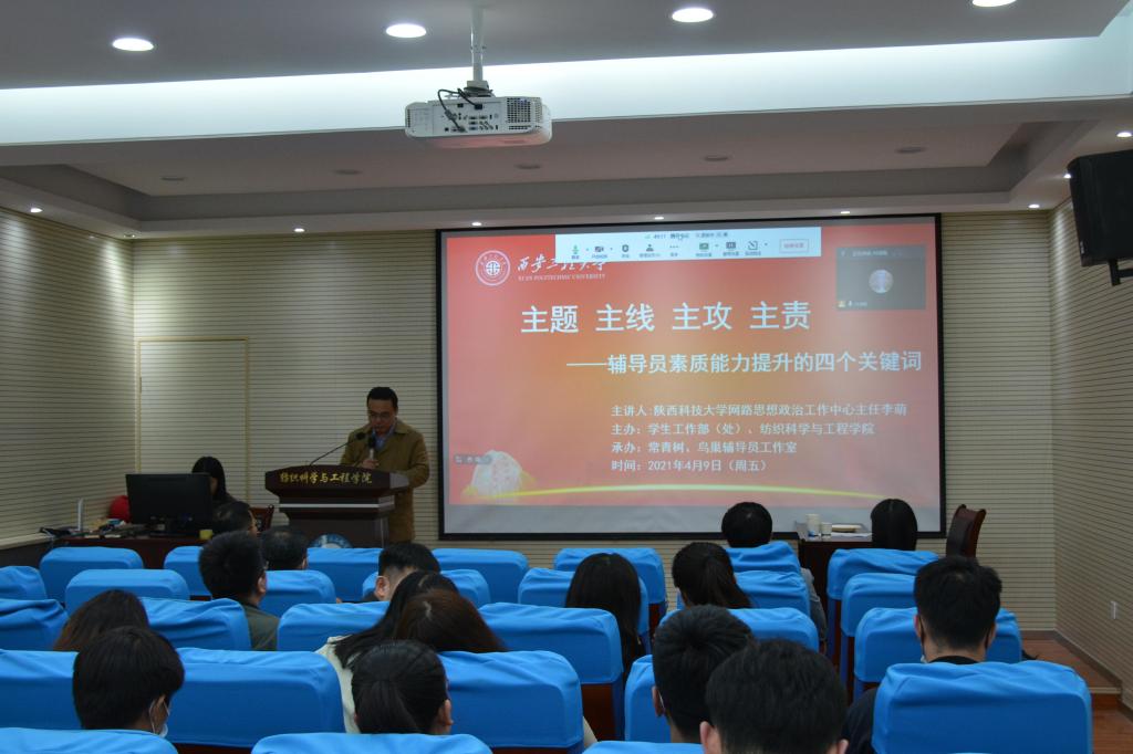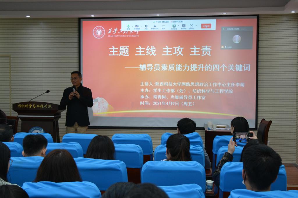 4月9日下午,我校在金花校区纺织楼姚穆报告厅举办我校2021年第1场辅导员业务培训。陕西科技大学网络思想政治工作中心主任李萌以视频会议的形式为我校辅导员作了题为《主题、主线、主攻、主责——辅导员素质能力提升的四个关键词》的报告。本次培训是我校辅导员队伍2021年第1场业务培训,由学校学生工作部(处)主办,常青树辅导员工作室、鸟巢辅导员工作室承办,近四年入职的辅导员现场集中参加,其他辅导员在线分散参加。suncity太阳新城党委书记李伟出席培训会。常青树辅导员工作室主持人、suncity太阳新城学生工作办公室主任赵勇进主持培训会。
