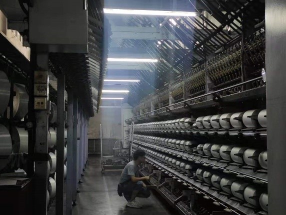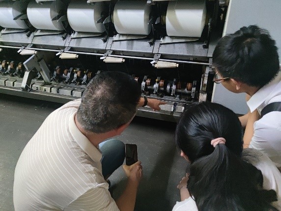 带着有着浓厚学习兴趣,学生很快地进入生产车间,开展了对涤纶化纤加弹工艺的分析与研究,加弹工艺对涤纶长丝的上机可织造性起着关键作用,通过加弹工艺,对预取向丝(POY)进行拉伸变形处理,得到可直接用于织造的拉伸变形丝(DTY),DTY的物理性质更为稳定,便于织造。在此期间,除了对涤纶长丝加弹生产工艺进行研究学习之外,王业宝等3名研究生还对绍兴友邦涤纶氨纶有限公司下属的涤涤复合丝进行了生产工艺研究。在生产部技术员李元元的带领下,了解了一颗预取向丝从加弹、成检、再到自动包装,仓储出货的整个过程,对涤纶长丝的加弹工艺有了深刻的认识。