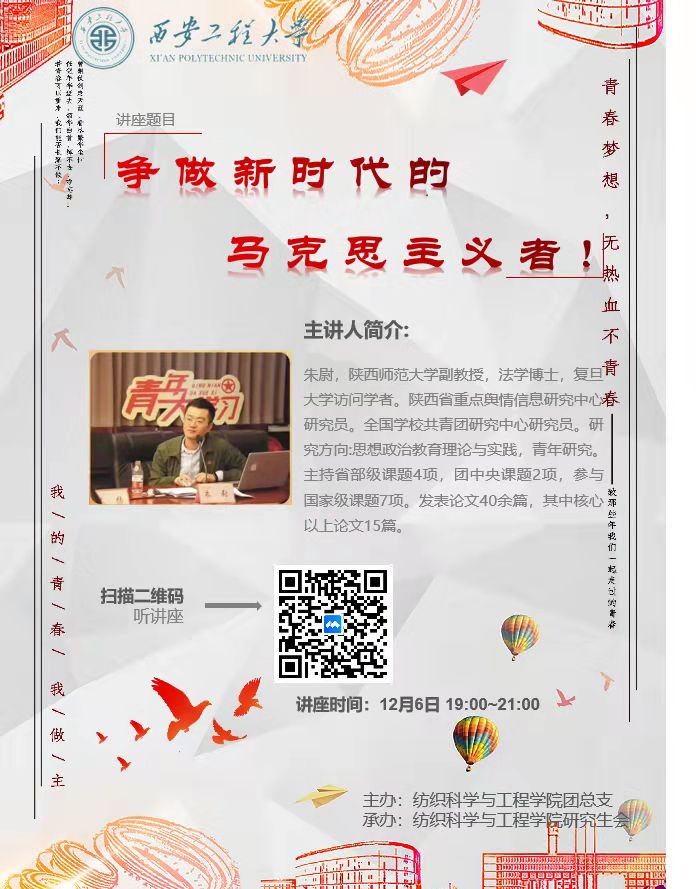2021年12月6日,suncity太阳新城邀请陕西师范大学马克思主义学院的朱尉教授,作题为“新时代如何做一名坚定的马克思主义者”的讲座。本次活动由学院三全育人导师团、团总支举办,学院研究生会承办。学院研究生党员、预备党员、入党积极分子聆听了讲座。