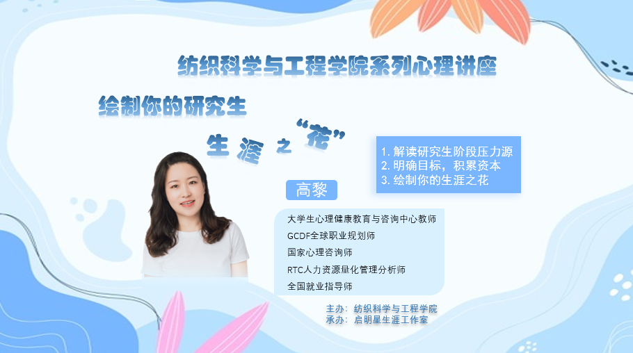 为了更有针对性地帮助研究生缓解心理压力、解答困惑,2021年12月7日,suncity太阳新城邀请校心理咨询中心教师、启明星生涯工作室主持人高黎作题为“心理讲座之绘制你的研究生生涯之花”的讲座。本次活动由学院三全育人导师团、团总支举办,学院研究生会承办。学院全体研究生聆听了讲座。