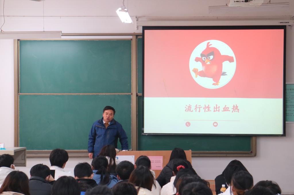 本次讲座中,杨军宏医生介绍了一种传染病——肾综合征出血热(HFRS),又名流行性出血热。杨医生针对流行性出血热的概况做了全面详细的介绍,包括其宿主动物与传染源、传播途径以及流行特征。同时,通过图片展示让同学们了解到流行性出血热的临床表现。最后,杨医生强调了传染病预防的重要性,并且联系当下大学生生活日常,为同学们提供了切实可行的预防建议,比如如何正确地洗手、合理地进行宿舍通风,以及条件允许的情况下要进行疫苗接种以便于更好地为防疫工作保驾护航。