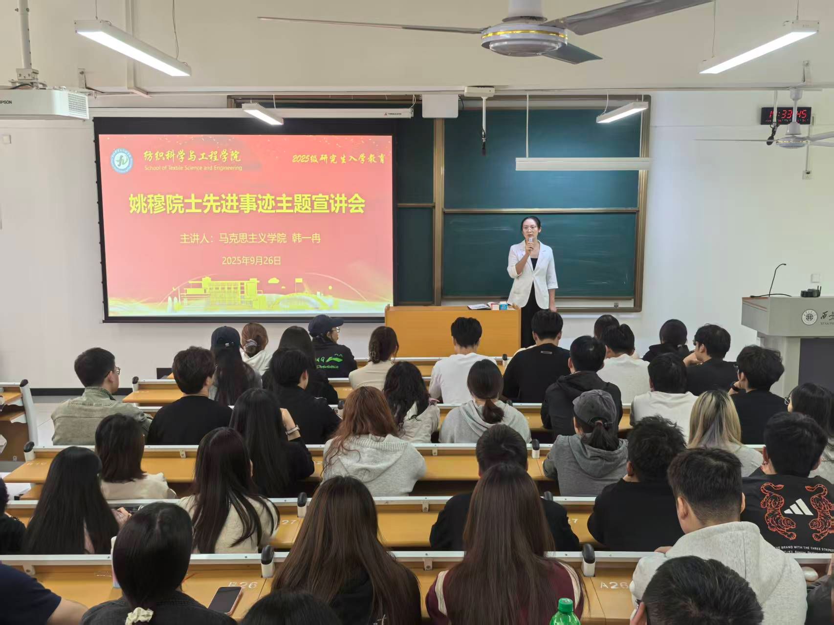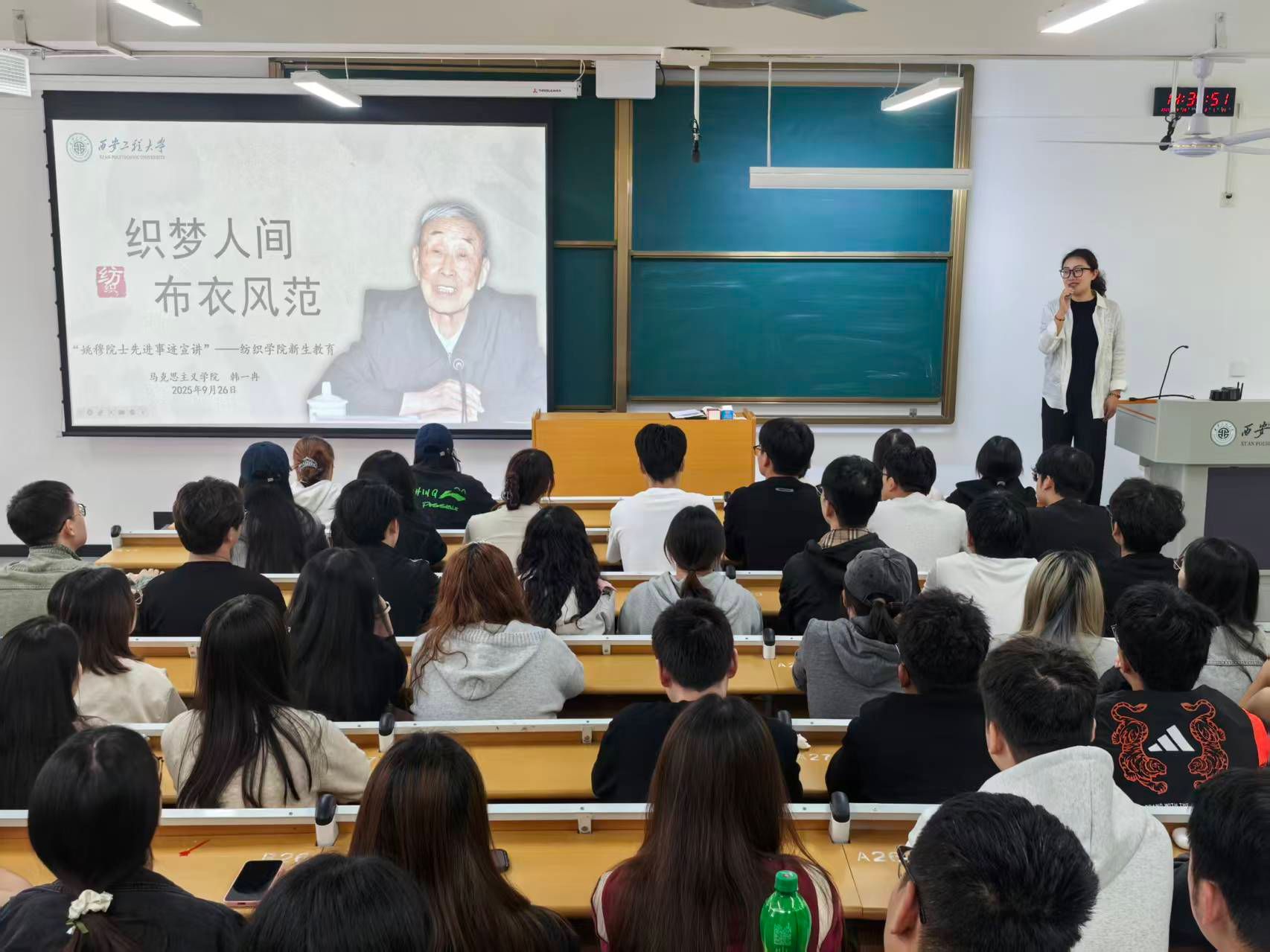 为引导2025级研究生厚植纺织情怀、坚定学术理想,2025年9月26日,suncity太阳新城特邀姚穆院士先进事迹宣讲团成员、马克思主义学院韩一冉,为2025级全体研究生开展“织梦人间,布衣风范”主题宣讲活动,深入学习姚穆院士的教育家、科学家精神。学院学生工作办公室主任兼硕士研究生辅导员姚婕和123名2025级研究生参加了活动,活动由姚婕主持。